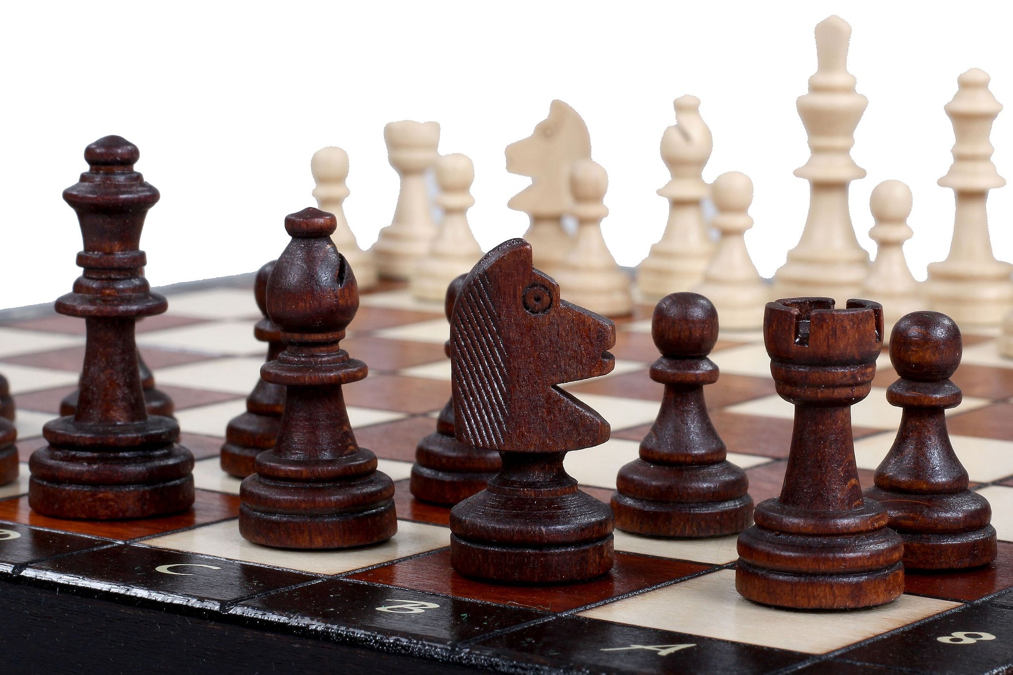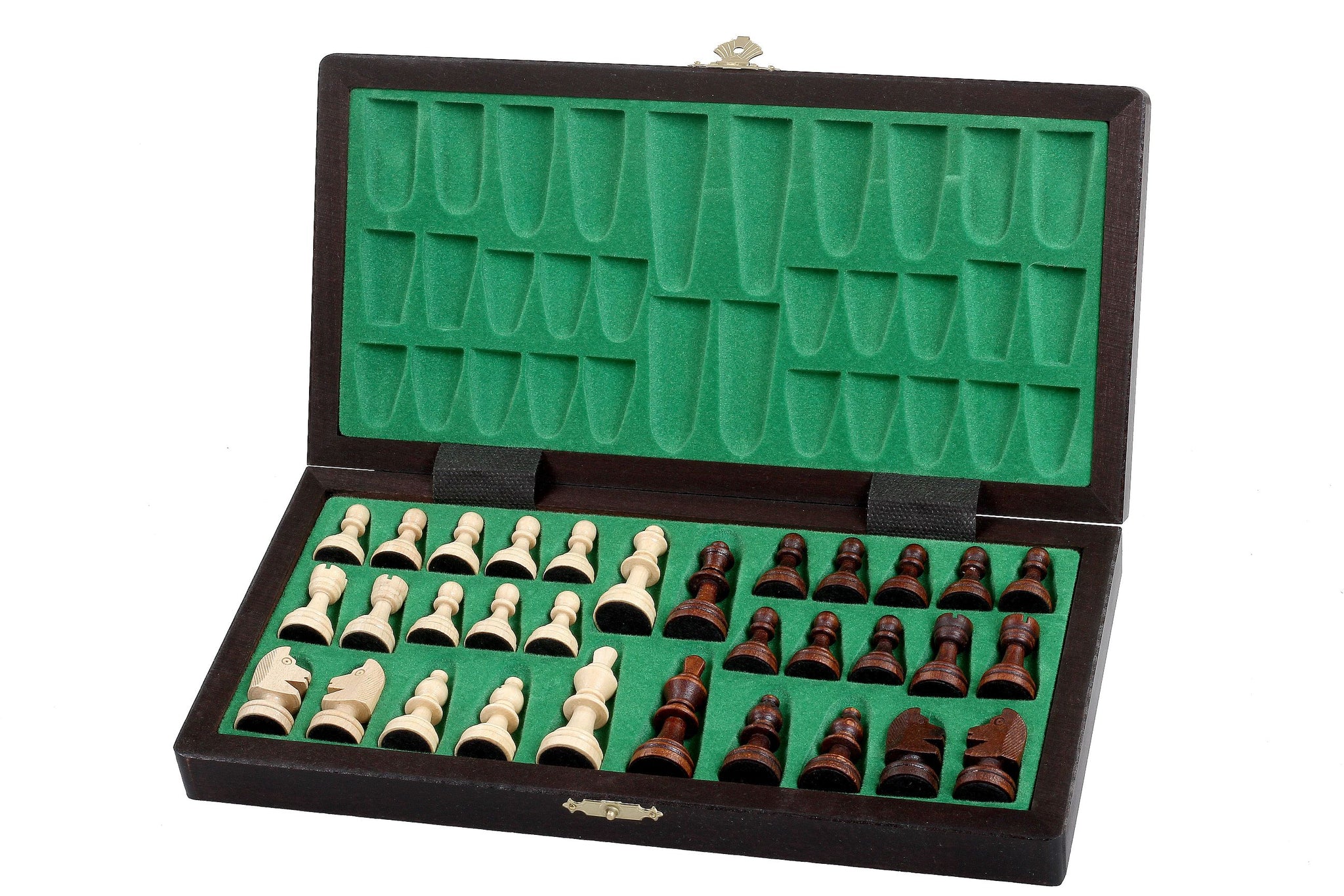 Jeu d'échecs magnétique classique en bois, dont les pièces ressemblent à celles utilisées dans les tournois professionnels. La hauteur du roi est de 5,5 cm.