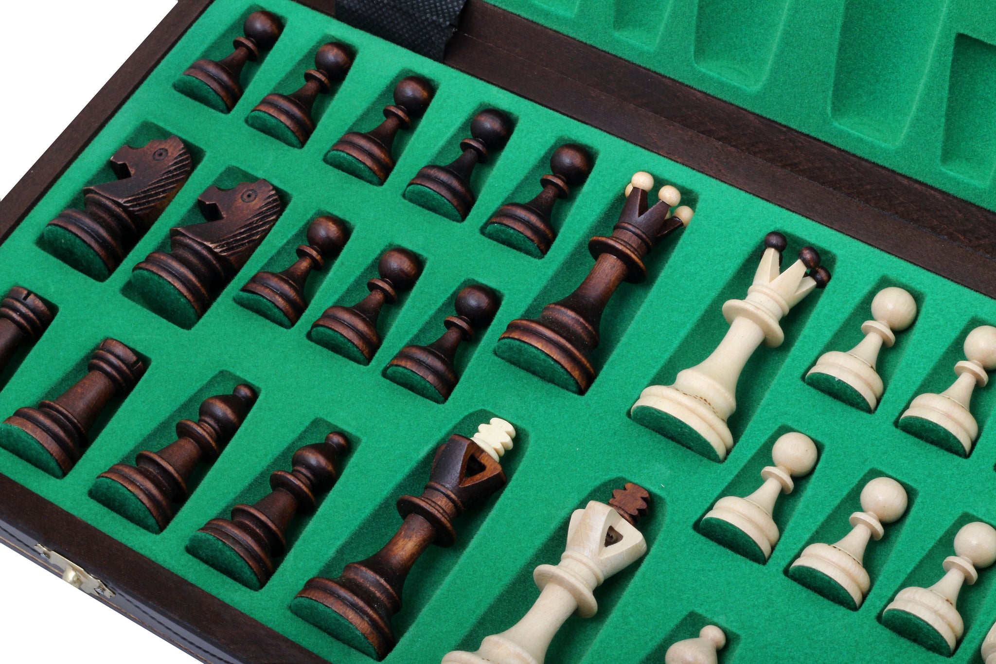 L'échiquier pliant de taille moyenne est muni d'une figurine insérée à l'intérieur.
