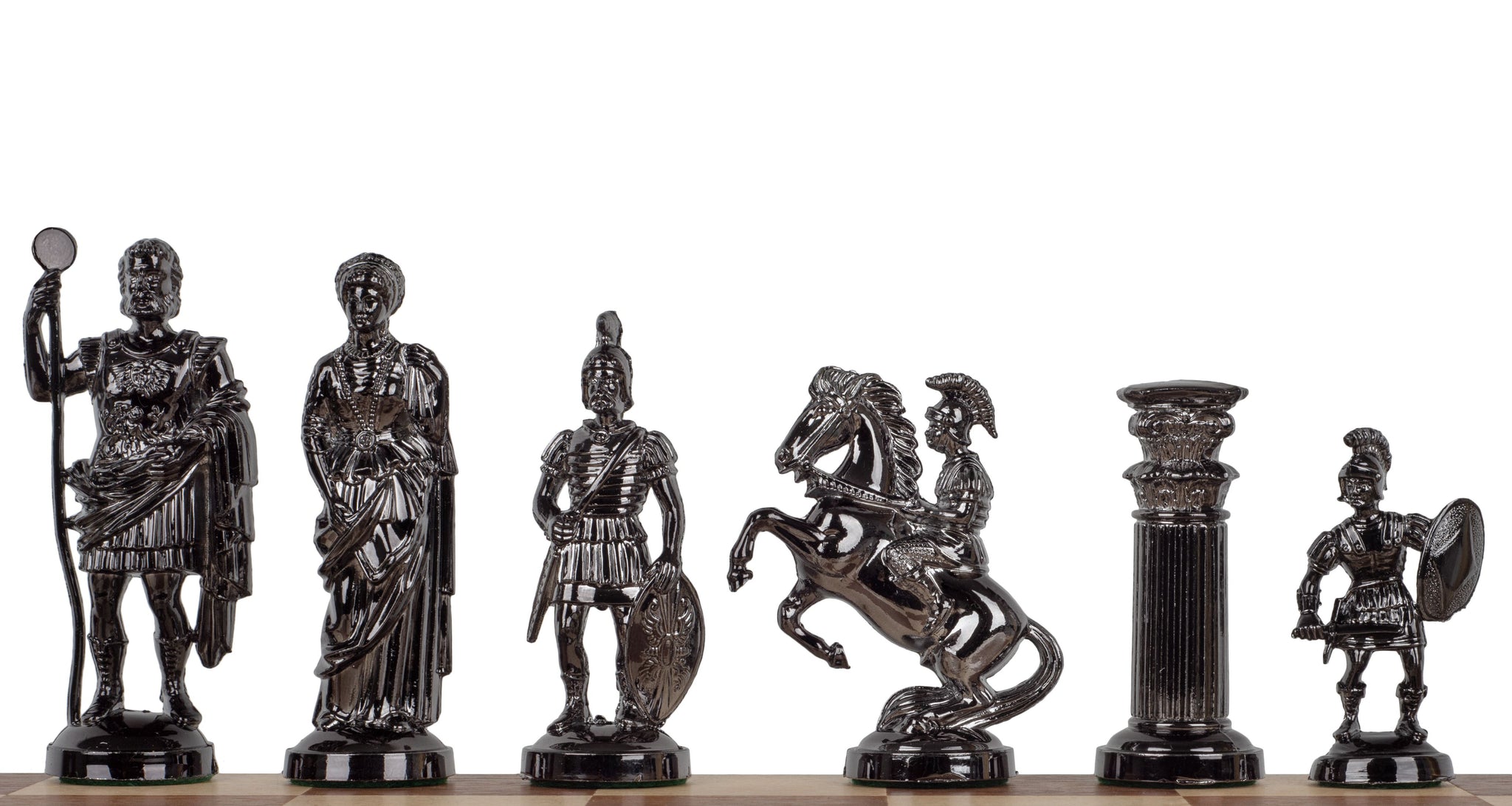 Pièces d'échecs en plastique, lestées et métallisées pour ressembler à des pièces moulées en métal brillant. Stylisées sur le modèle des personnages de l'époque de l'Empire romain. La hauteur du roi est de 98 mm, les pièces sont magnifiques aussi bien sur des échiquiers en plastique que sur des échiquiers en bois.